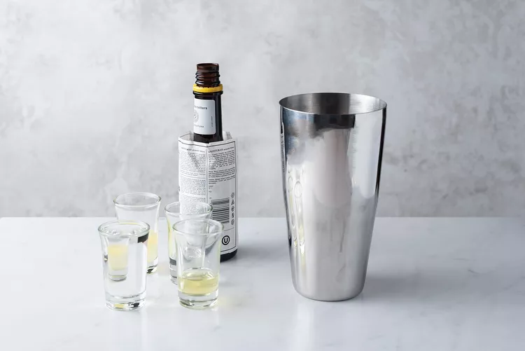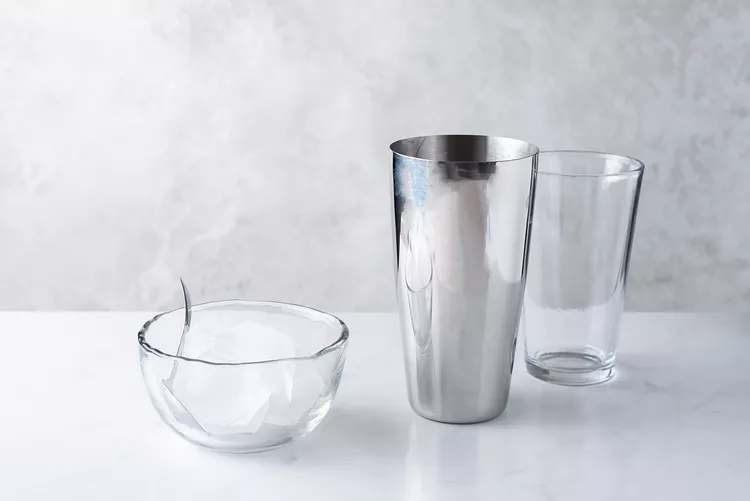 4、在摇壶中加入冰块,用力摇晃至少30秒。